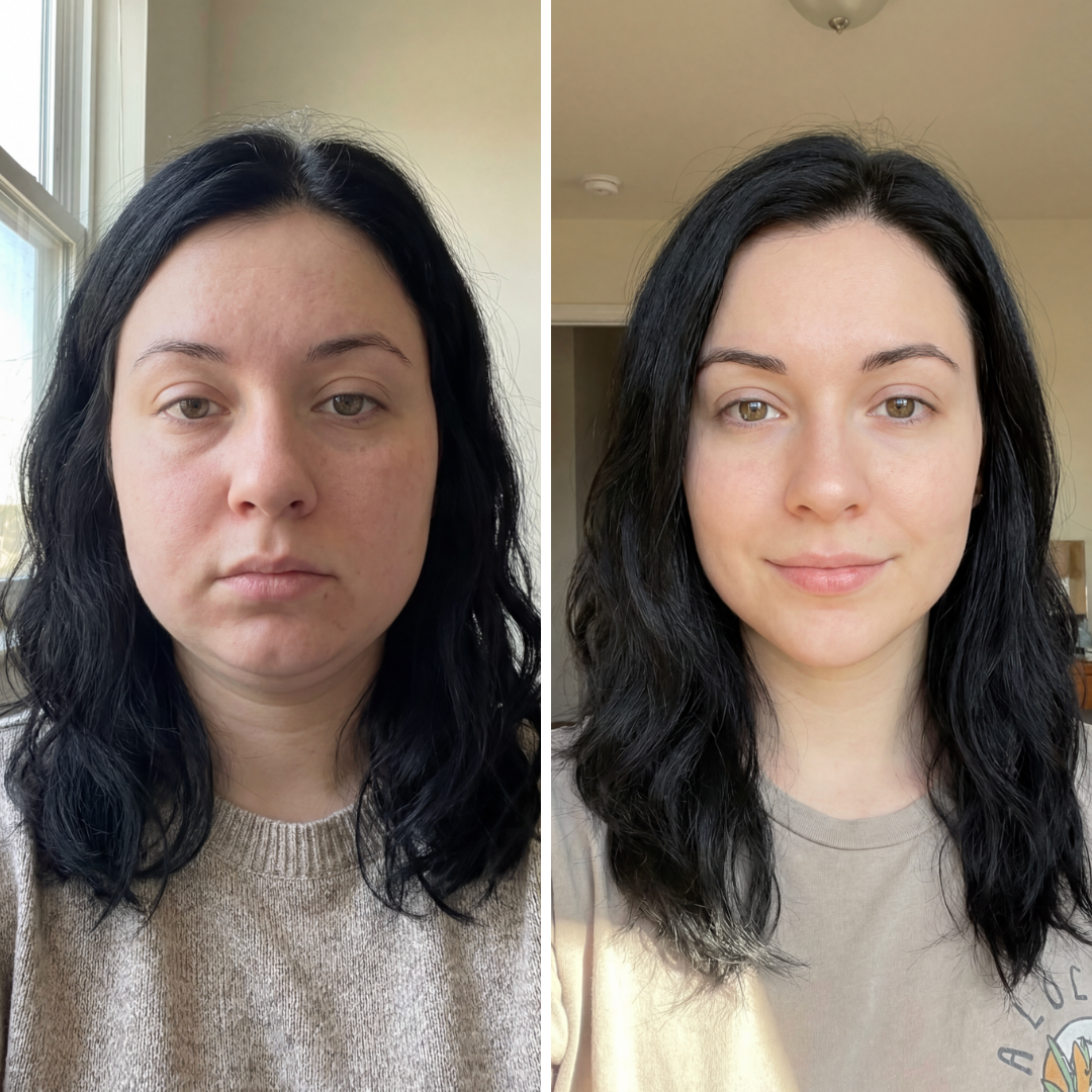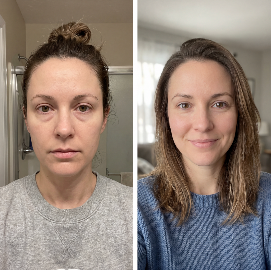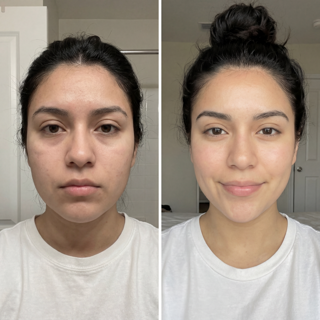 Visible de-puffing and a healthy, natural glow. Skin looks fresher, smoother, and more awake β ideal in the morning or before an event.