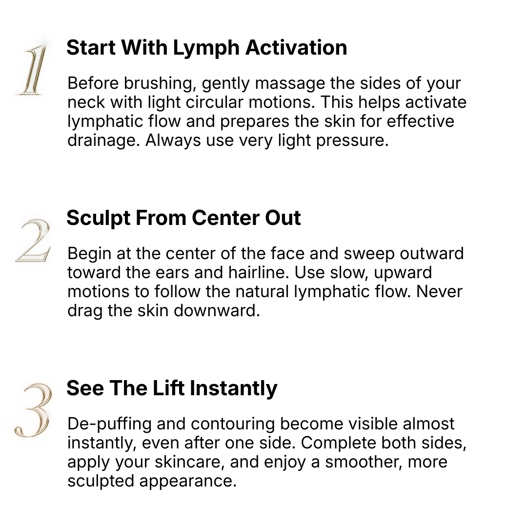 Through gentle sweeping motions, this brush helps encourage drainage beneath the skin β reducing puffiness, refining facial contours, and revealing a naturally radiant complexion.